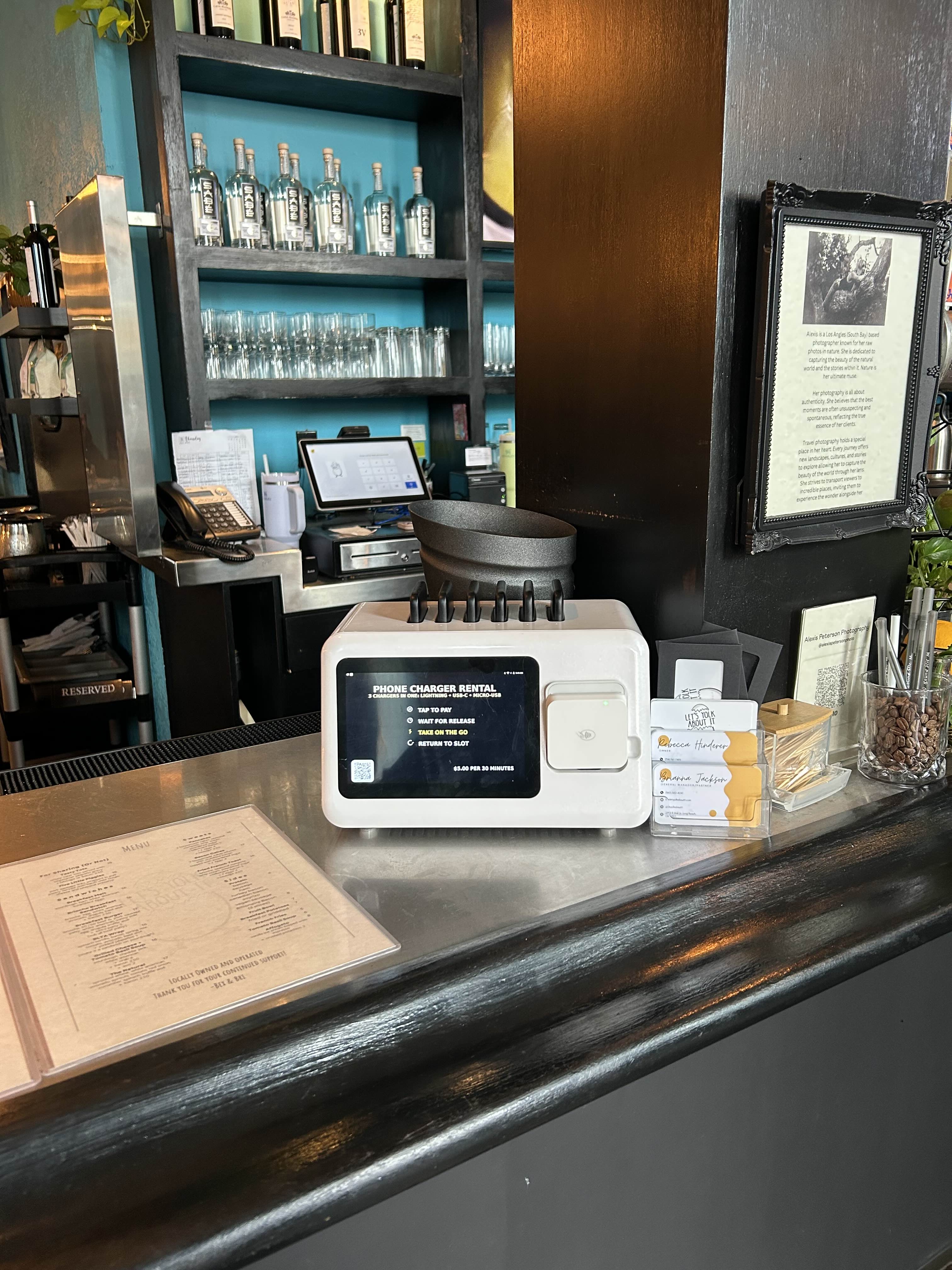 Guests rent portable chargers by the hour with built-in USB-C, Micro-USB, and Lightning cables—no staff involvement required.